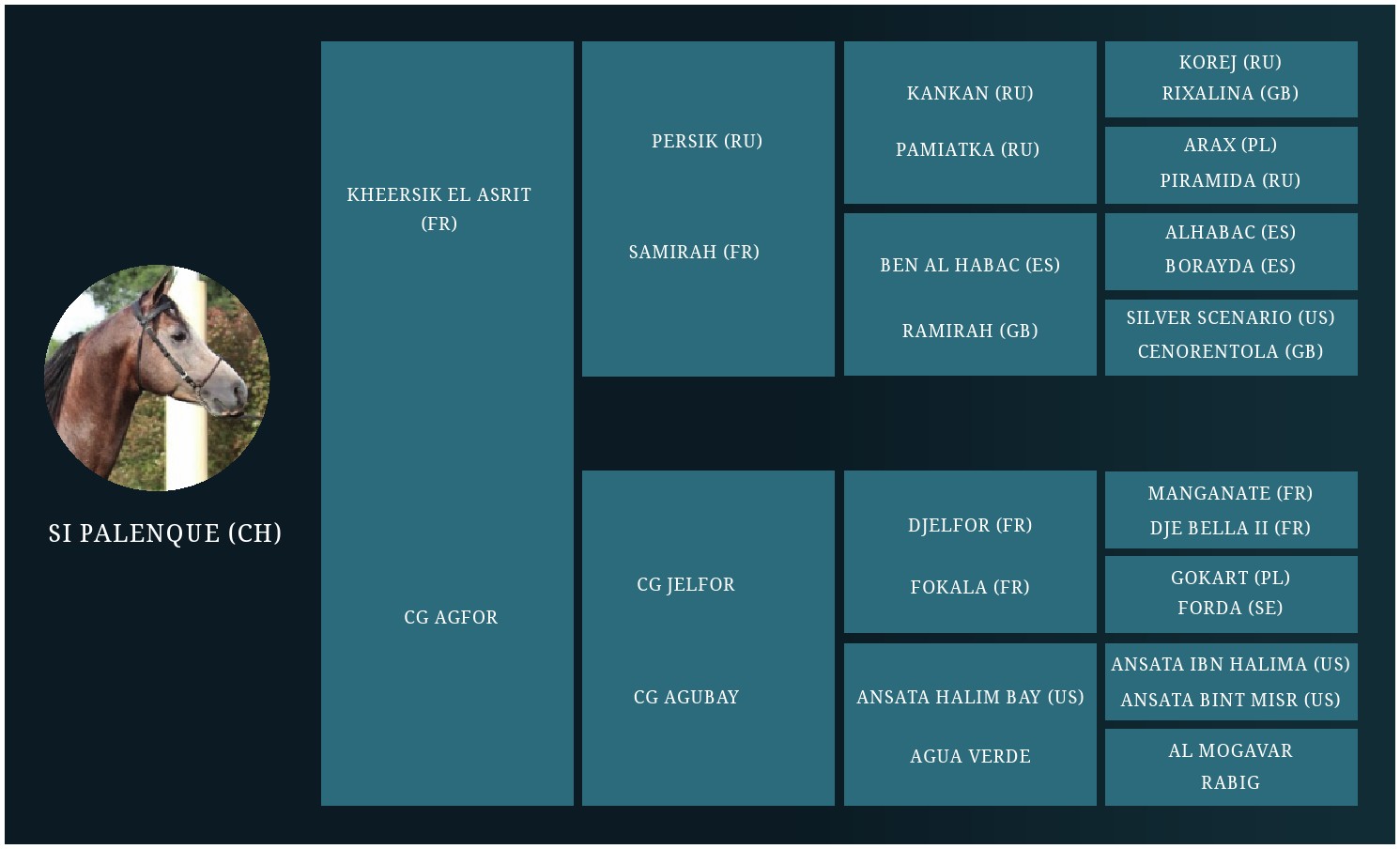 Su madre CG Agfor posee un pedigree altamente deportivo con un 'open cross' de orígenes Polaco, Frances, Egipcio y Crabbet agregando un gran vigor genético, con excelentes desempeños en las pistas de hipódromo en él. Es de destacar aquí, el padrillo Djelfor, uno de los pilares en las sangres deportivas francesas.