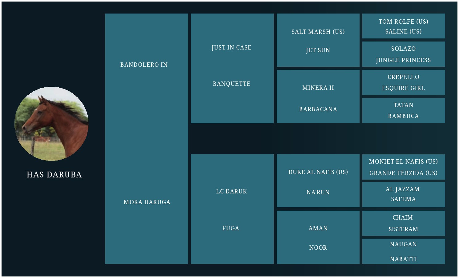 Su sangre materna, tiene orígenes muy exitosos en las carreras de hipódromo. Su madre es hermana materna de Moro Famoso (Sayang (US)) quien fuera ganador y récord de velocidad en 2.000 mts. (y exportado a Emiratos Árabes Unidos); y es hija de LC Daruc (Duke al Nafis (US)), múltiple ganador, exportado a Qatar y productor de ganadores, como Moro Dargaz.