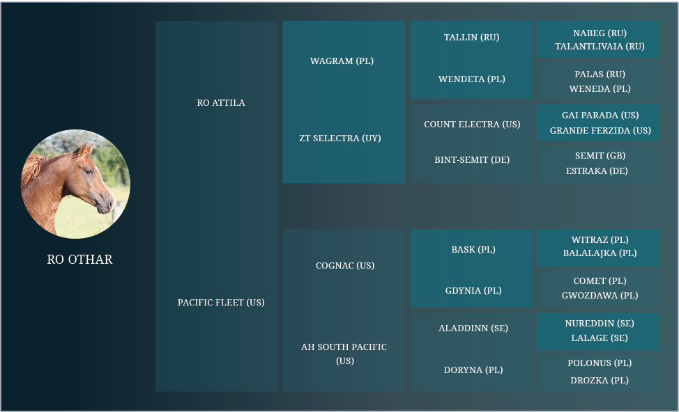RO Othar es un hijo de Pacific Fleet (US) productora de 4 ganadores en carreras de enduro, incluyendo a RO Fabiola (Wagram (PL)) (ganadora en EAU) y RO Centurión (Wagram (PL)) (uno de los padrillos en el haras en la actualidad).